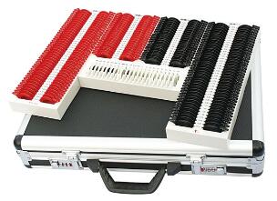 驗光鏡片箱包含箱體、箱蓋和扣件,箱體分區(qū)排布用于驗光試鏡的鏡片插槽,其中,箱體的左、右兩側(cè)分別為負球鏡片區(qū)和正球鏡片區(qū),該 兩區(qū)之間的左側(cè)為負柱鏡片區(qū),右側(cè)為正柱鏡片區(qū),各區(qū)有序排布相應 序列鏡片的橫向插槽,并標有試鏡片的辨識符號;其特征是箱體還設(shè)有 附屬鏡片插槽,棱鏡片插槽和漸進多焦點鏡片序列插槽,該三序列共分 布為左右兩個區(qū),左區(qū)對應位于負柱鏡區(qū)下方,右區(qū)對應位于正柱鏡區(qū) 的下方;左區(qū)設(shè)有24個橫向插槽,共分為12排,每排含有左右兩個插槽,包括附屬鏡片序列中的12個插槽和棱鏡片序列12個插槽,各槽標有對應鏡片的辨識符號。